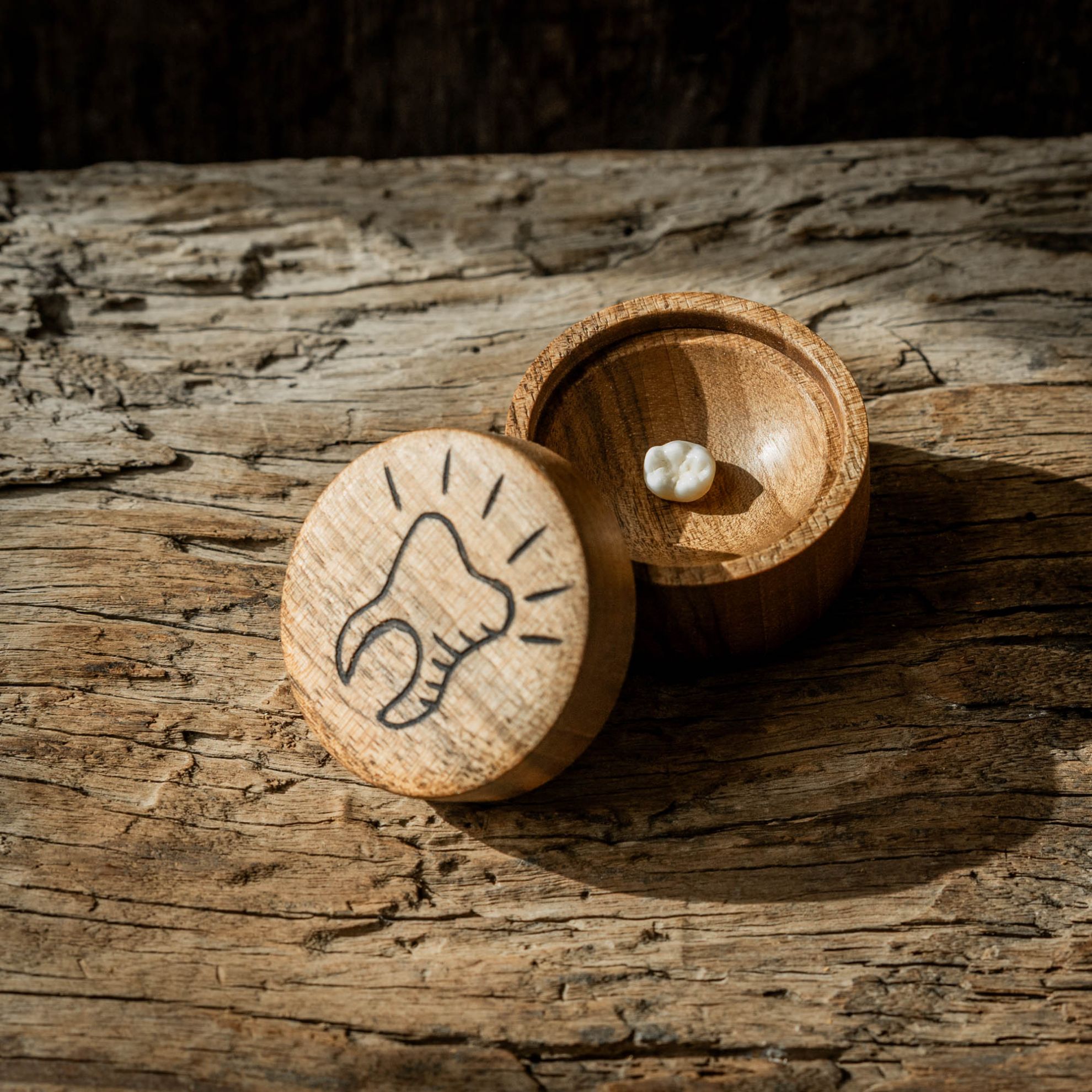 Petites boîtes à dents en noyer tournées à la main, gravées d’un motif de dent. Des objets artisanaux doux et naturels, parfaits pour garder les premiers souvenirs d’enfance.
