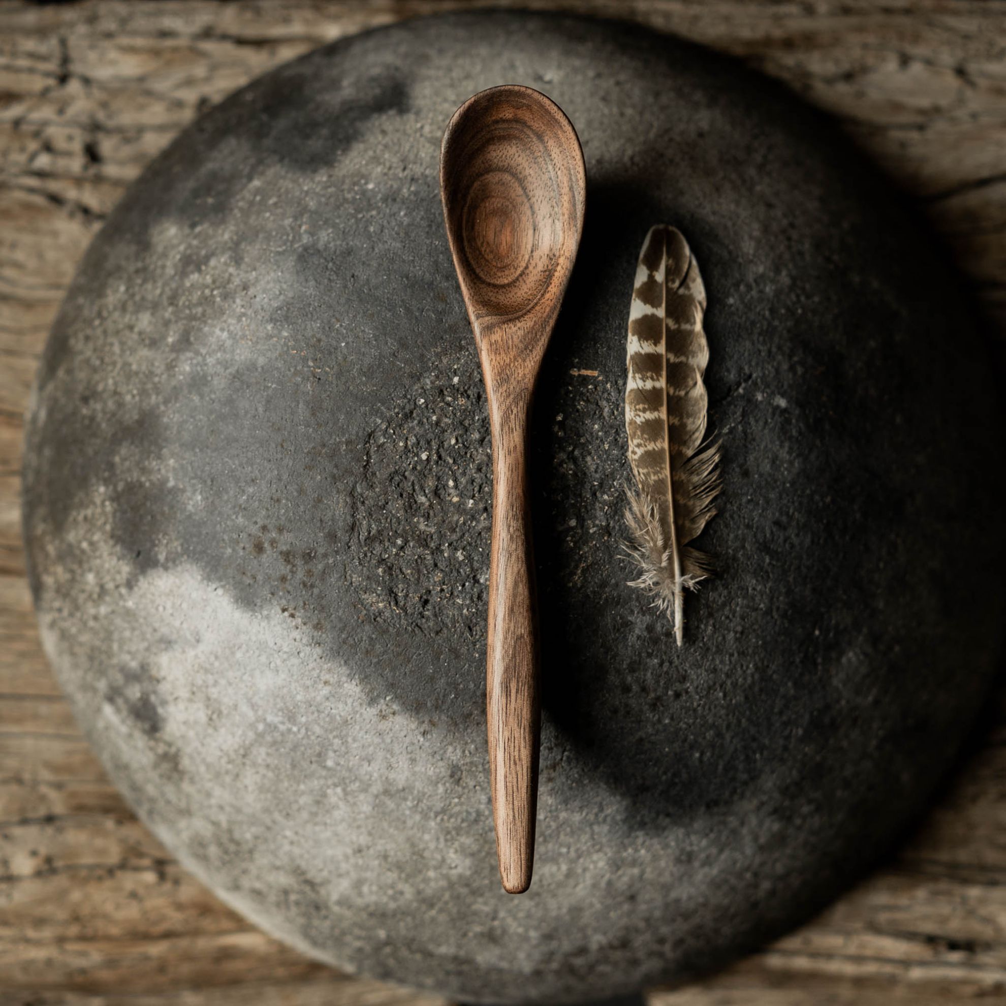 Chaque cuillère est façonnée à la main dans une pièce unique de noyer, sculptée, poncée et huilée avec soin. Les différences de formes et de teintes témoignent de la singularité du travail artisanal.