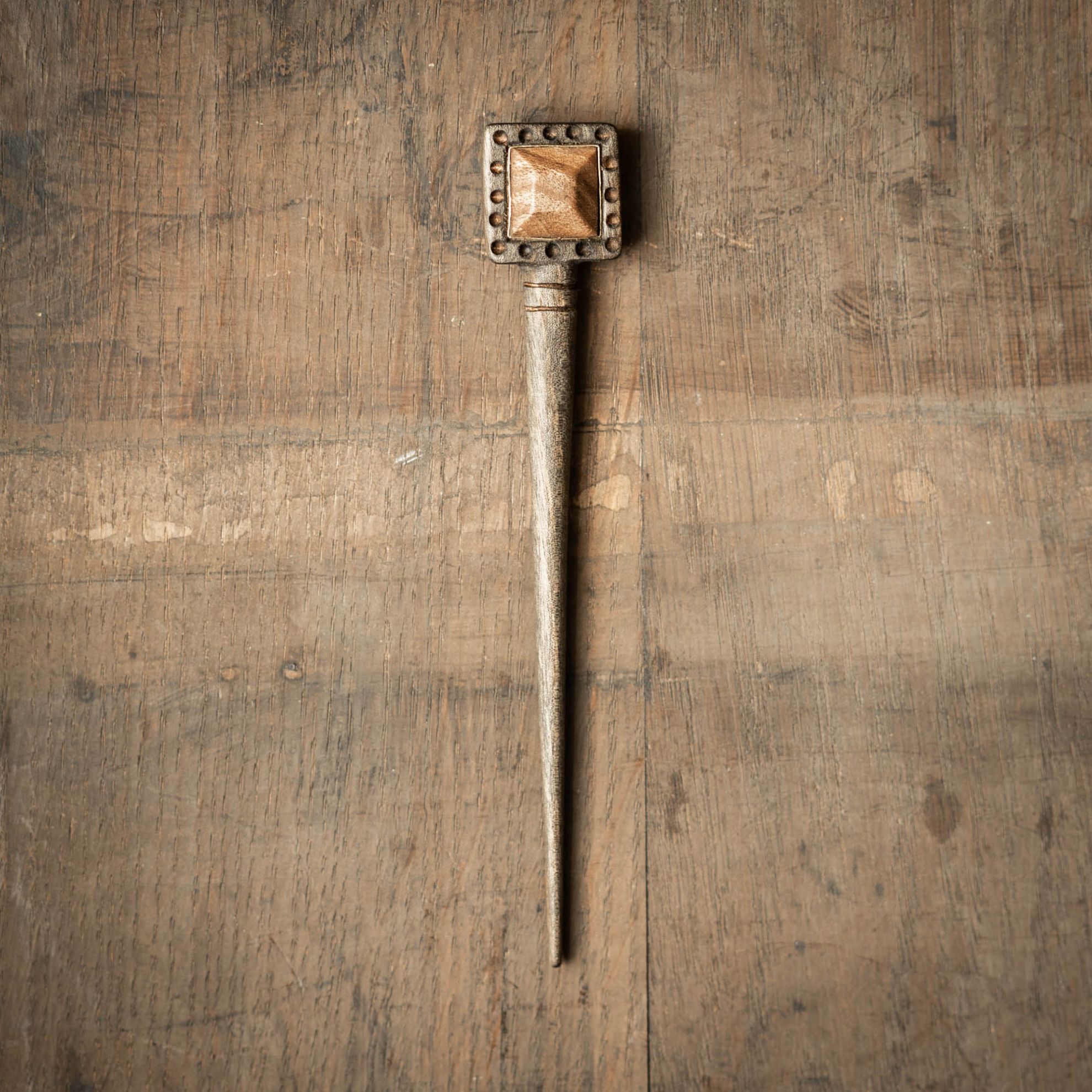 Ce pic à cheveux incarne la rencontre entre la simplicité du bois et la délicatesse du métal. Sculpté dans un beau noyer au grain chaud et profond, il se termine par un carré de bois serti d’un fil de laiton qui en souligne la forme. Discret mais raffiné, il apporte une touche d’élégance naturelle à toutes les chevelures.