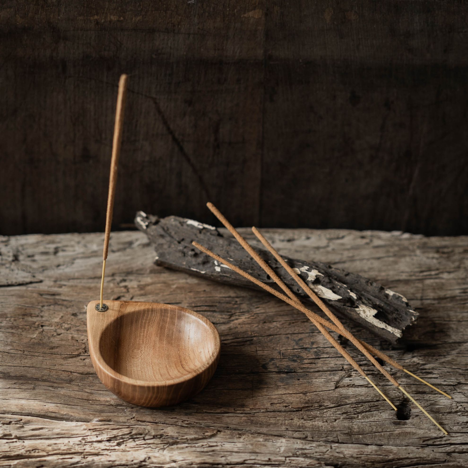Chaque pièce est creusée à la main à l’aide de gouges traditionnelles, sans machine ni moulage. Cette approche artisanale confère à chaque porte-encens une forme et une texture uniques. L’orme révèle ici sa beauté brute, ses veines vivantes, sa simplicité naturelle.
